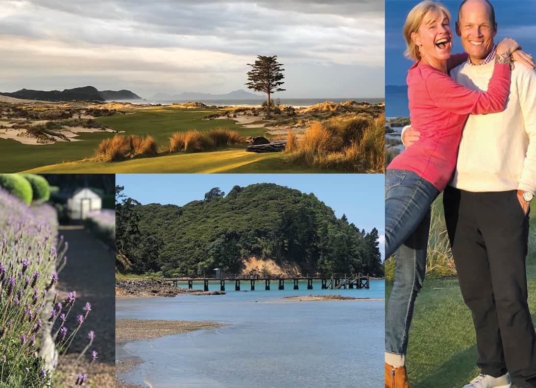 Clockwise from top left: Tara Iti ; Linda with husband, Charlie at Tara Iti; Waiheke Island; Mudbrick Vineyard